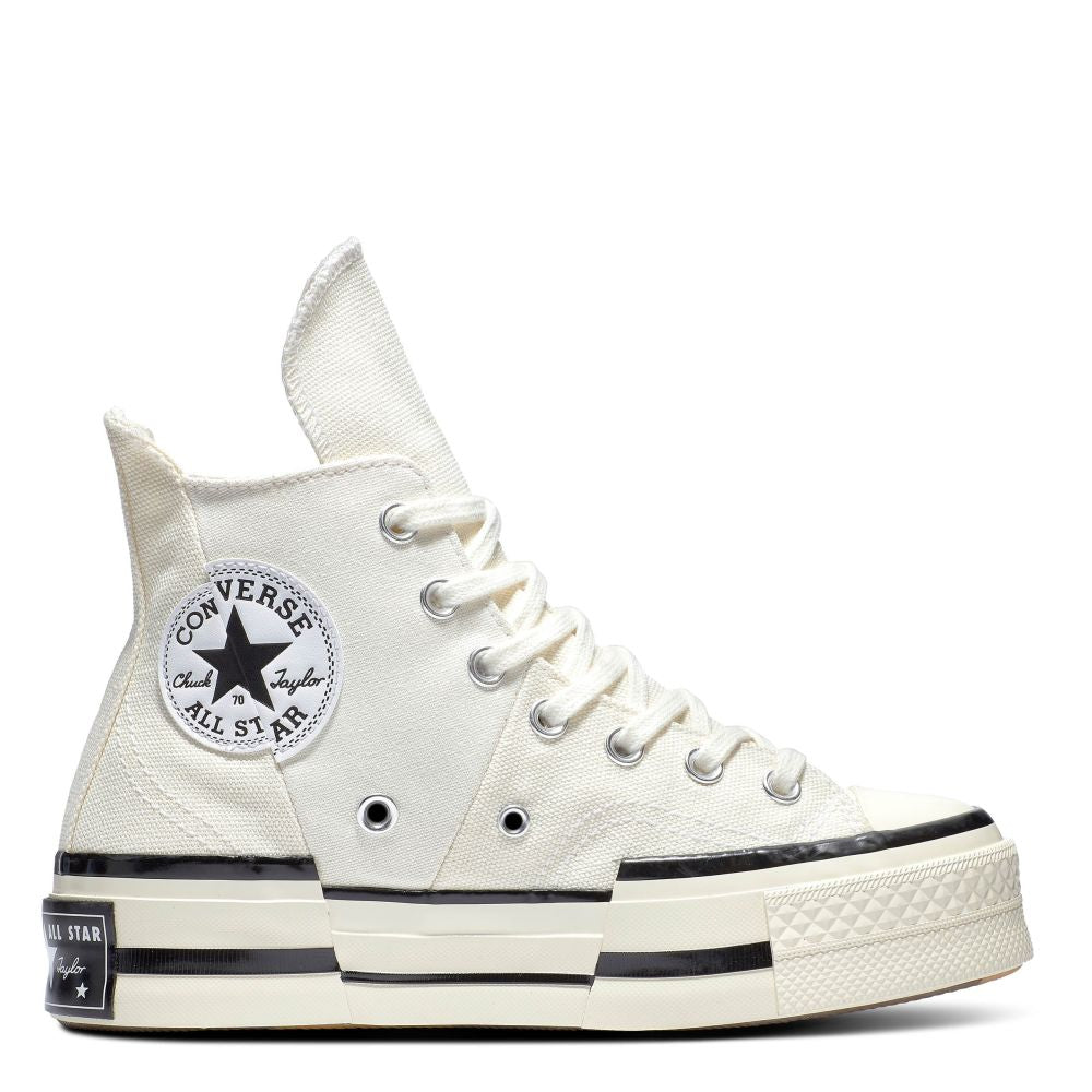 An unexpected update on an all-time classic, the Chuck 70 Plus mixes iconic features with future-forward styling. A fusion of mixed-weight canvas comes together with bold, asymmetrical lines for a statement-making look. Spliced rubber and ankle patch details keep all eyes on you, while premium cushioning helps you stay light on your feet.