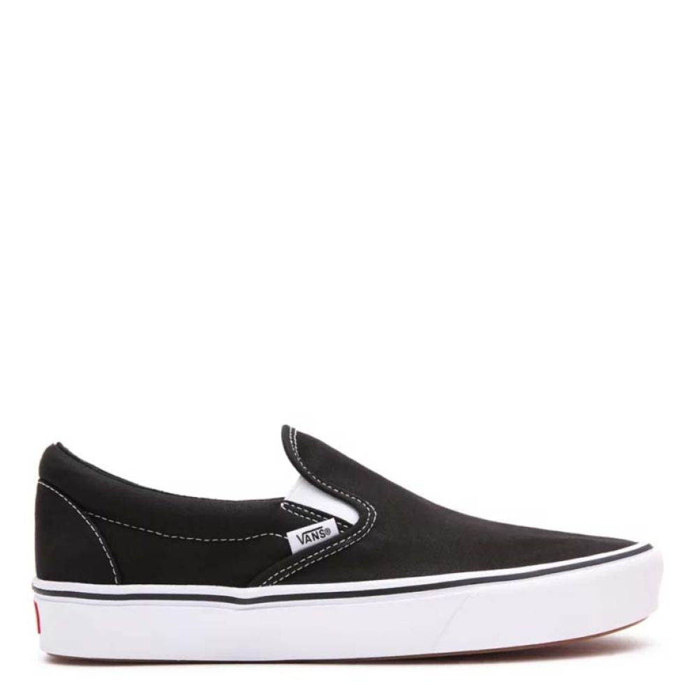 The ComfyCush Slip-On in Black/True White; this Vans classic skate shoe combines the classic low top silhouette with the latest in technology from Vans, Comfy Cush, to create a lighter and more comfortable shoe with its rubber and foam fusion cupsole. All of this coming together to not only create an incredibly comfortable fit but the most comfortable running-out-the-door fit.